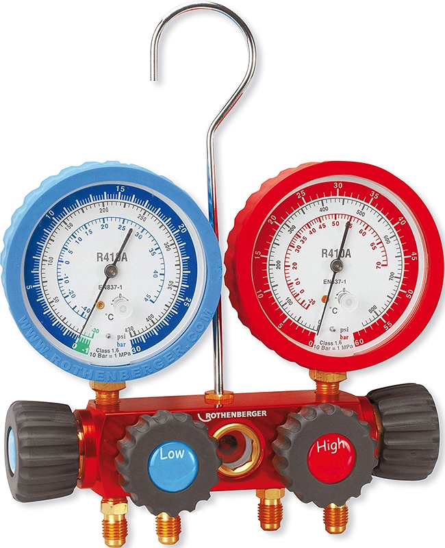 - Четырехпозиционный аналоговый манометрический коллектор для хладагентов R410A, R32 Rothenberger 5/16 SAE