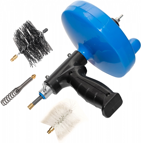 – 3 насадки: универсальная, малый ерш Ø 50 мм для труб Ø до 50 мм, большой ерш Ø 76 мм для труб Ø до 100 мм - Спираль смотана в барабане: хранение спирали в барабане позволяет производить прочистку труб в чистоте, а после прочистки хранить спираль без запахов и в компактном виде