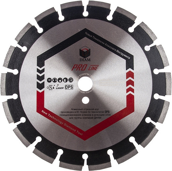 Сегментный алмазный круг Diam Pro Line 1A1RSS Асфальт 300 мм (Диам Про Лайн 1А1РСС Асфальт 300 мм) – профессиональный алмазный отрезной диск с лазерной сваркой сегментов, произведенный по технологии DPS (позиционирования алмазов в режущем слое), для сухой и мокрой резки асфальта с тяжелым наполнителем, асфальтобетона, абразивного песчаника, кирпича и других абразивов на резчиках швов, стенорезных машинах, бензорезах, электрических резчиках и плиткорезах, камнерезных станках и другом оборудовании, как с водяных охлаждением, так и без него.