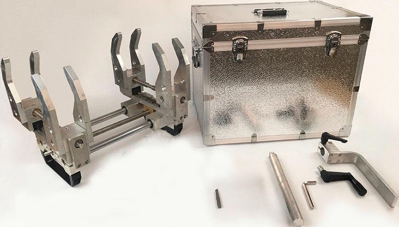 - 2 каретки: одна неподвижная, другая перемещается по раме при помощи центрального винта – на каждую из кареток можно установить как зажим для трубы, так и зажим для фитинга, входящие в стандартную комплектацию, что делает центратор удобным и универсальным