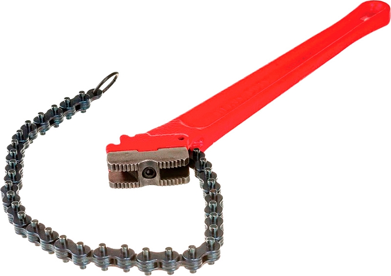 - Прочная цепь из специальной стали c улучшенной термообработкой: пригоняется под трубы всех указанных диаметров; обхватывает трубу по всему радиусу, за счет этого усилие распределяется равномерно по поверхности трубы