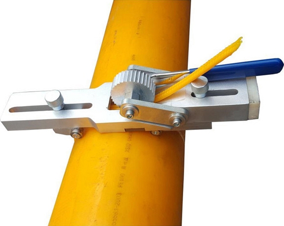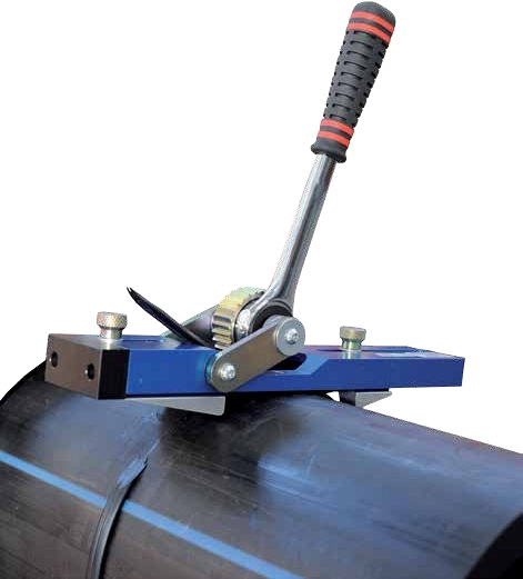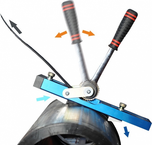 - После окончания стыковой сварки полимерного трубопровода, устройство устанавливается на сварочный шов и с помощью храпового механизма перемещается по окружности трубы, и тем самым одновременно лезвие устройства удаляет наружный сварочный грат
